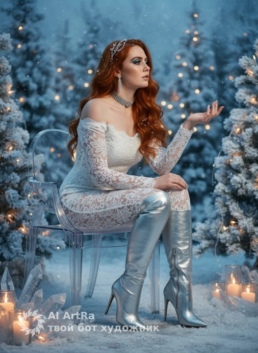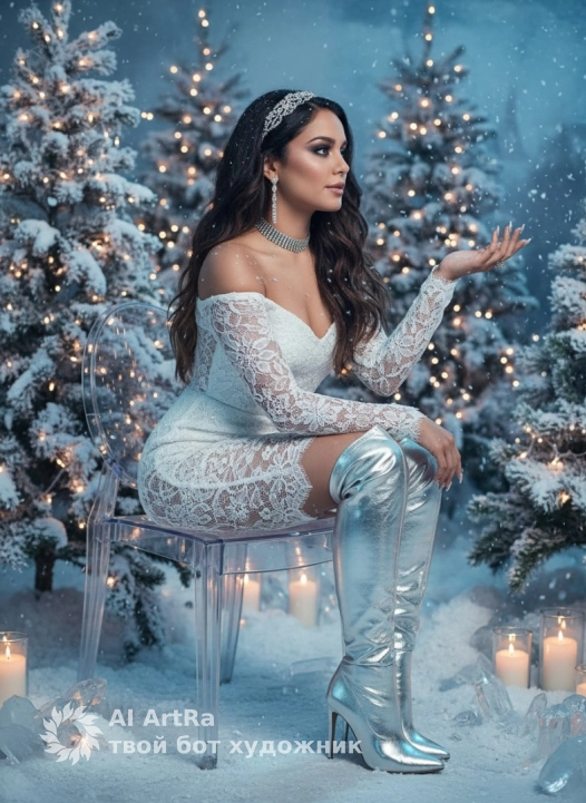 Используйте внешний вид пользователя, референса 1:1 — лицо, кожу, волосы и тело без каких-либо изменений. Изображение представляет собой высококачественный фотorealistic портрет в зимней фантастической атмосфере: женщина сидит на прозрачном стеклянном стуле, слегка повернувшись в профиль, одна рука лежит на колене, другая поднята ладонью вверх, словно ловит падающий снег; её лицо украшено драматичным макияжем с глубокими тенями на веках, чётким контуром губ и акцентом на бровях, на лице и теле видны мелкие снежинки; на голове — изящный серебристый ободок с кристаллами, на шее — массивное ожерелье-чокер с бриллиантами, на ушах — длинные свисающие серьги-подвески с кристаллами; ногти выполнены в стиле френч-маникюра с блестящим лаком; она одета в белый кружевной комбинезон с открытыми плечами, украшенный вышивкой в виде снежинок, и высокие металлические серебряные сапоги на шпильке, отражающие свет; фон — зимний сказочный лес с заснеженными елями, украшенными тёплыми гирляндами, на полу — ледяные кристаллы и горящие свечи в стеклянных подсвечниках; освещение мягкое, рассеянное, с холодным синеватым оттенком, подчёркивающим снежную атмосферу, с контрастными тёплыми бликами от свечей; камера снята с лёгким нижним ракурсом, композиция симметрична, с акцентом на центральную фигуру; масштаб — средний план, от колен до макушки; настроение — волшебное, загадочное, праздничное, с лёгкой ноткой меланхолии.