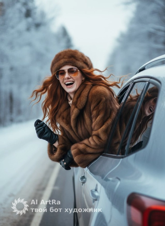 Стильная модель в коричневой меховой шубе и меховой шапке‑берете, янтарные очки‑авиаторы, чёрные кожаные перчатки с вырезами; смеётся и динамично высовывается из бокового окна серебристого кроссовера, развевающиеся волосы. Зимняя дорога на опушке, по сторонам густой лес, деревья покрыты инеем и снегом, холодная голубовато‑серая гамма; тёплый мех контрастирует с холодным фоном. Естественный рассеянный свет пасмурного дня, реалистичный lifestyle/fashion кадр, умеренная глубина резкости, чистые натуральные цвета; крупный план по пояс из окна, вертикаль 4:5, 35–50 мм, f/2.8–4, ISO 200–400, 1/250.