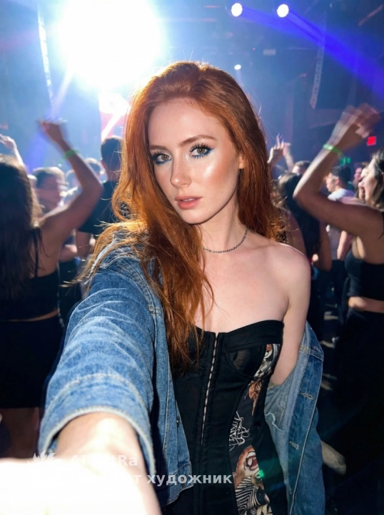 Девушка в стильном ночном клубе, освещённая с одной стороны подсветкой. Вокруг неё танцуют люди, а она тянет руку прямо к камере. На ней чёрное корсетное платье с уникальным дизайном, поверх которого на плечи накинута джинсовка, легко скользящая по плечам. Её ресницы пышные прокрашенные, нижнее веко подведено синим карандашом, подчеркивают взгляд, а хайлайтер на щеках придаёт коже здоровый блеск. На шее — тонкая серебряная цепочка. Волосы распущены, лёгкие и естественные. Фото сделано с использованием вспышки, что добавляет динамики и яркости изображению.