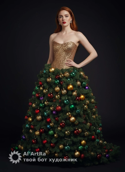 Студийный портрет женщины в модной редакции, композиция в центре, кадр в три четверти/в полный рост (от головы до подола), прямой взгляд в камеру, одна рука на бедре, другая расслаблена, гладкая прическа, красная помада, маленькие серьги-капли; лиф с золотистым мерцающим корсетом без бретелек (теплый металлик золотыми блестками) и пышной юбкой в виде рождественской елки, выполненной из реалистичных зеленых еловых веток, украшенных блестящими безделушками красного, золотого, зеленого, синего и фиолетового цветов; юбка длиной до пола полностью закрывает ноги (голени не видны), сохраняя естественные пропорции тела и корректируя длину ног под юбка (без укорочения нижней части тела), мягкий свет с едва заметным ободком, высокая контрастность, четкий фокус, реалистичные отблески блеска и орнамента, темный бесшовный фон.
