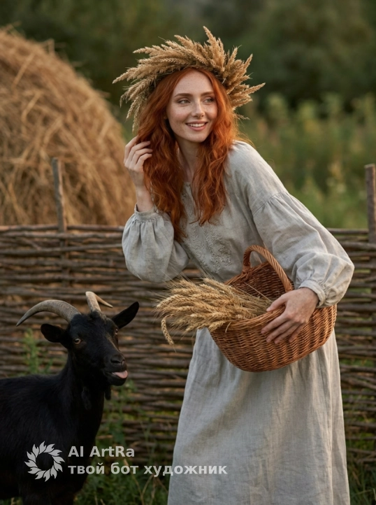Используйте внешний вид пользователя, референса 1:1 — лицо, кожу, волосы и тело без каких-либо изменений. На изображении — женщина в пасторальном сельском пейзаже, стоящая вполоборота к камере, слегка наклонившись вперёд, с улыбкой, взгляд направлен вправо от зрителя; в руках — плетёная корзина с пшеничными колосьями, левая рука ласково касается волос; на голове — венок из сухих трав и колосьев; на ней — длинное свободное платье из льна светло-серого оттенка с объёмными рукавами и вышивкой на лифе; рядом, слева, стоит чёрная коза с изогнутыми рогами, языком высовывает; фон — деревянный плетёный забор из необтёсанных веток, за ним — соломенная скирда и размытая зелёная растительность; освещение мягкое, рассеянное, вечернее, с тёплыми золотисто-коричневыми тонами, создающими ностальгическую, сказочную атмосферу; стиль — фотореализм с лёгкой художественной обработкой, напоминающей живопись; композиция — средний план, камера на уровне глаз, глубина резкости умеренная, акцент на фигуре женщины и козе; маникюр естественный, без лака; украшений нет; макияж нежный, с акцентом на глаза и естественным румянцем; общее настроение — спокойное, идиллическое, с оттенком мечтательности и гармонии с природой.
