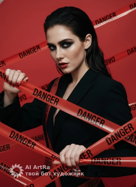 Не меняя внешности женщины с фото, перед нами эффектный и выразительный образ, где главная героиня позирует в полупрофильном положении, чуть склонив голову вперед и смотря прямо в камеру с дерзким, напряженным выражением. Ее густые волосы тщательно уложены назад, создавая эффект влажной текстуры и подчеркивая четкость черт лица. Лицо женщины акцентировано плотным дымчатым макияжем с глубокими тенями вокруг глаз и насыщенно красной матовой помадой, создающей вызывающий контраст с ровным светло-оливковым оттенком кожи, на которой отчетливо видны естественные веснушки. Она одета в черный пиджак с четкой строгой структурой ткани, который частично раскрывает зону декольте, неразличимо, есть ли под ним дополнительная одежда. Руки с идеально ухоженными ногтями, покрытыми ярким красным лаком, активно взаимодействуют с красной полиэтиленовой лентой с черной надписью «DANGER», которую женщина туго натягивает и перекрывает своим телом, образуя драматическую сеть из линий, пересекающихся на разной глубине. Освещение сцены направлено фронтально с легким смещением сверху, создавая мягкие yet отчетливые тени, которые моделируют рельеф лица и придают композиции кинематографическую выразительность. Фон полностью красный, без дополнительных визуальных элементов, что усиливает ощущение напряженности и угрозы, переносит внимание исключительно на героиню и символику лент. Вся сцена выстроена так, что взгляд зрителя ведется по диагоналям лент, пересекающихся между собой, а фокус остается на выразительном лице и уверенных жестах женщины, подчеркивая эмоциональную напряженность и загадочность момента, фотореалистичное изображение, высокая текстурная детализация, высокое качество, разрешение 8K.