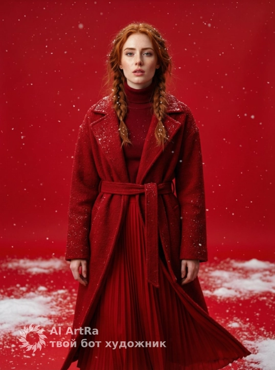 Ультрареалистичная редакционная фотография высокой моды. референс с двумя растрепанными косами, уверенно стоящей в монохромном красном окружении. На ней темно-красный свитер с высоким воротом, длинная плиссированная юбка до пола и тяжелое фактурное шерстяное пальто соответствующего красного оттенка, подпоясанное на талии. Вокруг нее мягко падает легкий снег, нежные снежинки оседают на ее пальто и волосах. Пол и фон — бесшовного, яркого алого цвета, с разбросанными пятнами белого снега, что создает поразительный визуальный контраст. кожа как у референса, с естественным сиянием, губы слегка приоткрыты, взгляд сильный и поэтичный.