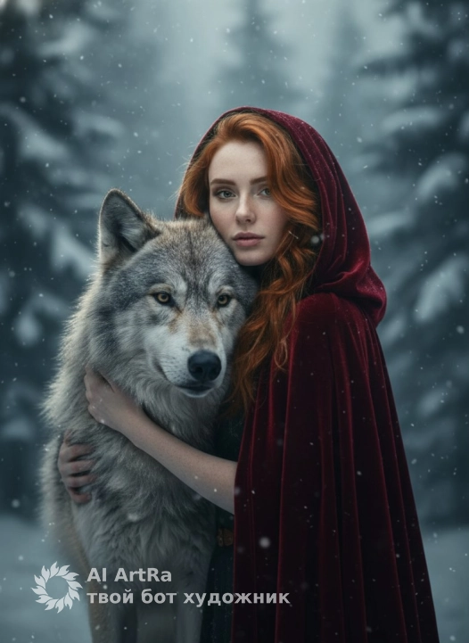 Кинематографический гиперреалистичный портрет женщины, не меняй черты лица стоящей в заснеженном лесу в сумерках, в темно-красном плаще с поднятым капюшоном, обрамляющим ее лицо. Ее длинные волосы мягко падают на лицо, несколько прядей развеваются на ветру. Она нежно обнимает массивного, величественного волка, его густой и фактурный мех слабо светится в сумерках. Волк стоит рядом с ней, его взгляд спокоен, но властен, создавая между ними интимный и защищающий момент. Снежинки кружатся в воздухе, добавляя волшебства и безмятежности атмосфере. За ее спиной размытые силуэты заснеженных деревьев сливаются с туманным фоном, а прохладные серо-голубые тона сумерек создают настроение. Освещение — кинематографичные мягкие сумерки, смешанные с теплым сиянием, отражающимся от ее плаща, отбрасывающим нежные блики на ее лицо и волчью шерсть. Сверхдетализированные текстуры: бархатная ткань плаща, густой мех волка, морозный воздух и натуральная текстура кожи. Разрешение 8 Кб, небольшая глубина резкости, кинематографическая композиция