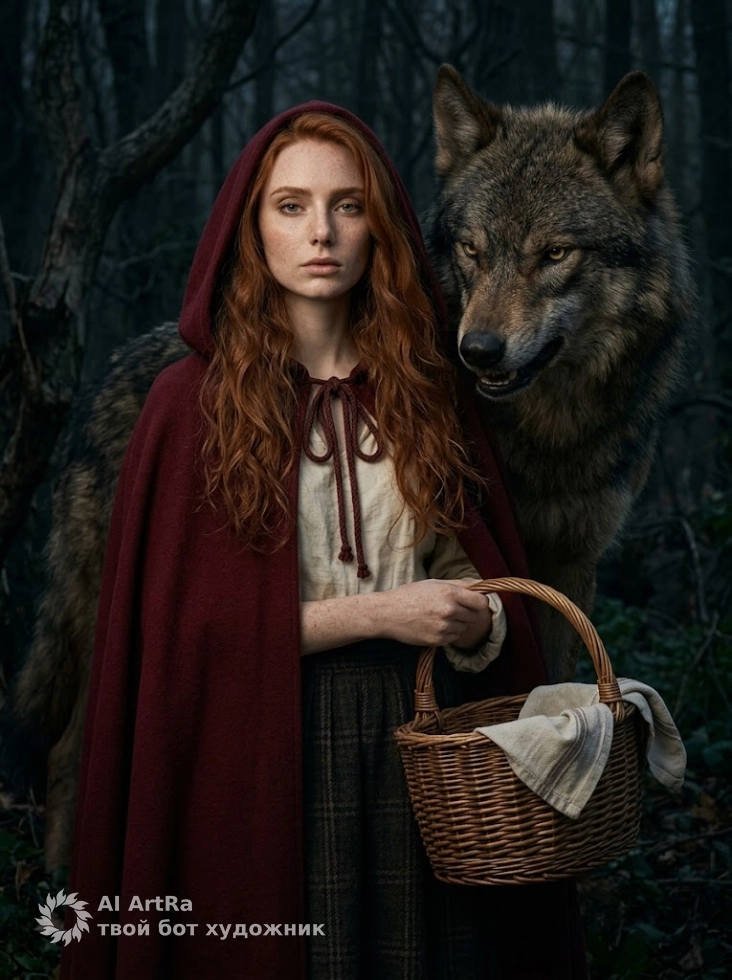 Представьте, как вы становитесь героем своей собственной истории – Красной Шапочкой, готовой к приключениям в мрачном лесу. В руках – плетёная корзина, а рядом – уверенный волк, добавляющий загадочности к вашему образу. Все детали важны: от текстуры кожи до выразительности взгляда, каждая деталь будет зафиксирована с максимальной точностью! И с Nano Banana PRO вы получите ещё и стабильный результат высокого качества.