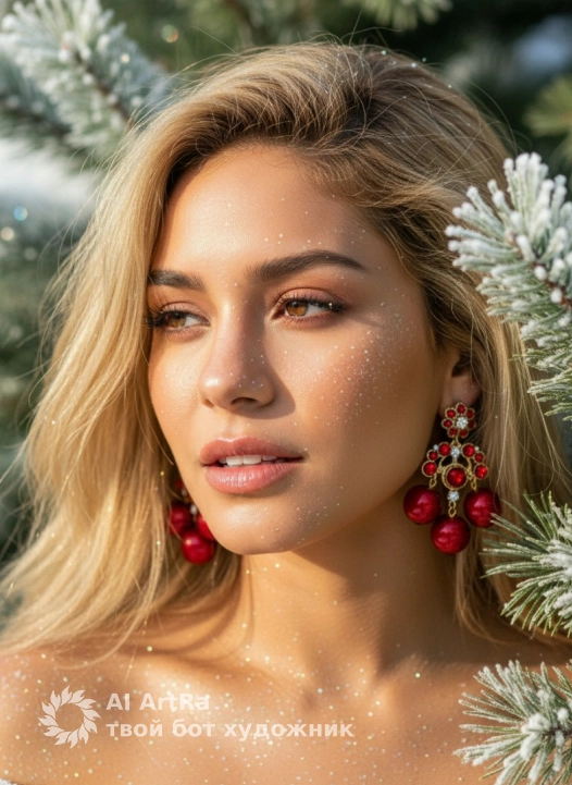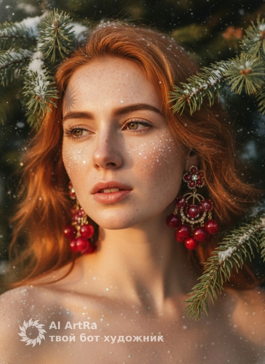 Не меняя внешности женщины с фото, перед нами бросается в глаза эффектный крупный портрет девушки с изысканным, слегка приоткрытым ртом и напряжённым выразительным взглядом, направленным чуть в сторону. Её кожа сияет от влажного блеска, словно покрыта изморозью и мелкими кристалликами, которые сверкают в солнечном свете, усиливая ощущение магической зимней сказки. Лицо украшено густыми искрящимися пайетками и точечными блёстками, подчеркивающими гладкость и свежесть кожи, а по щекам и носу разбросаны естественные веснушки, придающие образу живость и природность. Густые длинные волосы светлого цвета частично закрыты крупными еловыми ветвями, на которых лежат снежные крупинки, добавляя контраст и атмосферы свежего мороза. Девушка носит необычные массивные серьги в виде гроздьев ярко-красных блестящих ягод, напоминающих вишни, которые словно переливаются на солнце, а их блеск поддерживают мелкие кристаллы, встроенные в цветочные элементы креплений — детали, от которых невозможно оторвать взгляд. Свет падает преимущественно слева, создавая мягкие тёплые тени на её лице и ключицах, что добавляет глубину и объём, а плечи женщины частично открыты, лишь слегка покрытые снегом и блестками, оставляя одежду однозначно неразличимой. Фон скрыт за плотной зеленью хвои и снежными оттепелями, что поддерживает рождественскую, снежно-зимнюю атмосферу, усиливая ощущение праздника на морозном воздухе. Вся композиция снята с близкого расстояния, с хорошей резкостью и высокой детализацией кожи, волос и украшений, при этом баланс цветов выдержан в теплых оранжево-золотистых и холодных зеленовато-белых оттенках, создавая эффект изысканной, почти волшебной игры света и текстуры, сопровождаемой лёгкой дымчатой глубиной заднего плана. Это торжественное, эмоциональное изображение наполнено чувственной тишиной зимнего утра, где каждый элемент — от инея на волосах до ярких серёжек — рассказывает свою историю, фотореалистичное изображение, высокая текстурная детализация, высокое качество, разрешение 4K.