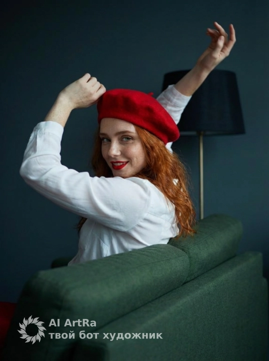 На голове ярко-красный берет. Он является главным цветовым акцентом на изображении и сразу привлекает внимание.