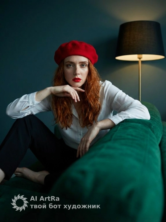 Основные цвета — темно-синий фон, зеленовато-серый диван, белая рубашка и ярко-красный берет с помадой. Контраст между спокойным фоном и красными акцентами делает образ выразительным.
