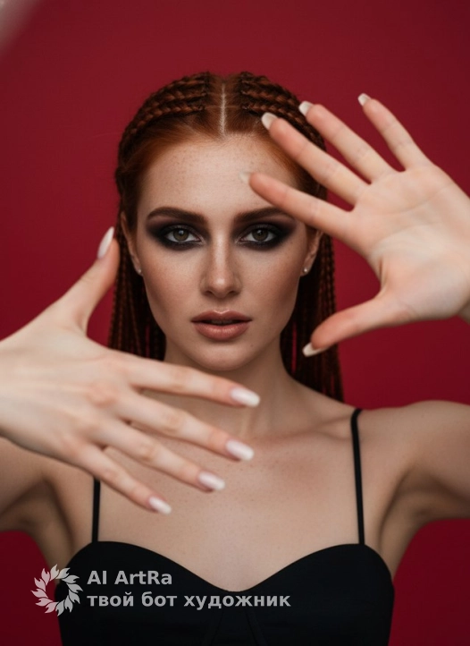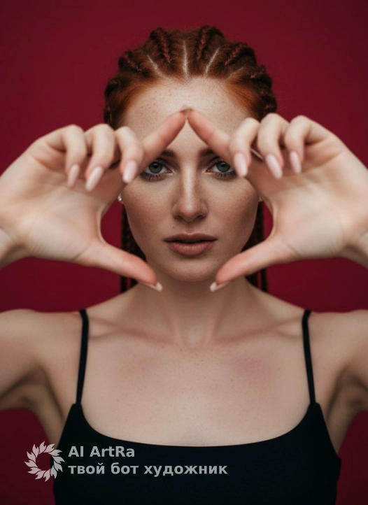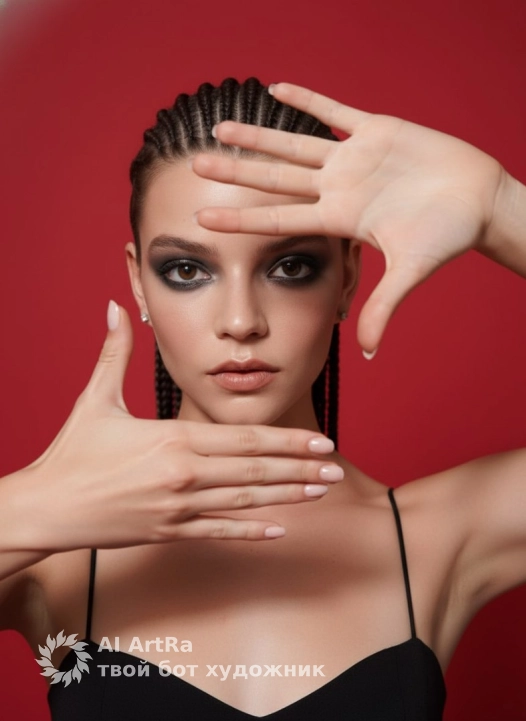 A studio portrait of the model looking directly at the camera through a frame made of her own hands, a close-up up to the chest, a central composition with an emphasis on the face and the gesture of her hands, expressive makeup with smoky eye shadow, nude lipstick, hair in small braids pulled back to reveal the face and small stud earrings, dressed in a simple black top with thin straps, long nails covered with light polish, a uniform saturated red background, soft, even studio lighting without harsh shadows, emphasizing the texture of the skin and the contours of the face, shot on an 85mm portrait lens with a medium depth of field, a photorealistic style of contemporary studio photography, highly detailed, photorealistic.