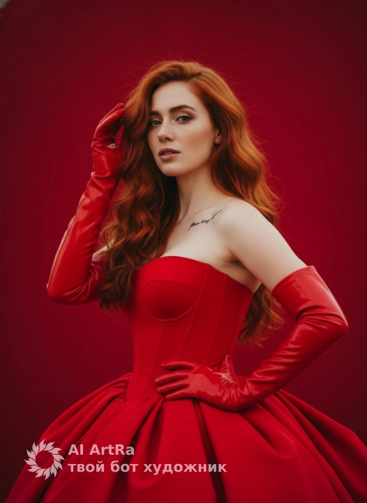 Не меняя внешности женщины с фото, сцена наполнена атмосферой интенсивного красного света, подчеркивающего глубину и насыщенность цветов в кадре. Женщина чуть повернута в полоборота к камере, её взгляд направлен прямо вперёд, полон уверенности и мягкой сексуальности, с приоткрытыми губами. Длинные, волосы спадают крупными локонами на плечи и грудь, создавая выраженный контраст с однотонным красным фоном. Она одета в эффектное платье красного цвета с плотной текстурой, верх которого облегает тело в форме корсета, а низ пышный, словно подушечка, придающая композиции объем и динамичность. На руках надеты длинные, ярко-красные перчатки из блестящего материала, которые словно переливаются в свету и становятся продолжением силуэта, добавляя элегантности и драматизма образу. Левая рука женщины касается бока, а правая поднята возле головы, удерживая локон волос, в этом жесте ощущается изящество и легкая игривость. Свет падает мягко, выделяя рельеф лица и тела, создавая тонкие тени под скулами и в складках ткани, что усиливает глубину и объем изображения. На левом плече видна надпись-татуировка, детали которой неразличимы. Общая композиция передает чувства роскоши и уверенности, благодаря гармонии красного цвета и тщательно выстроенному светотеневому рисунку, что создаёт кинематографический эффект, погружающий в атмосферу стилизованной сцены. фотореалистичное изображение, высокая текстурная детализация, высокое качество, разрешение 4K.
