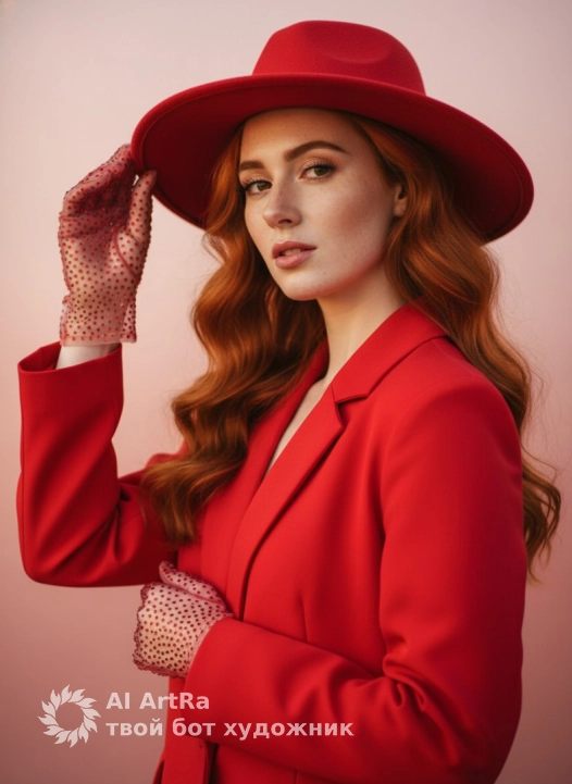 A close-up portrait of a woman in a bold red outfit, including a structured red blazer and matching wide-brimmed red hat. 3/4 angle, looking into the camera. She wears translucent red rhinestone-studded gloves that fit snugly against her hands, with her fingers resting elegantly on the lapel of the blazer and near the brim of the hat. She wears makeup with an even, matte skin tone, mascara, and pink lips. Her hair is styled in soft waves. The lighting is warm and directional, creating soft highlights and shadows on the subject. The background is a smooth pink gradient, moving from lighter to darker tones, with soft light creating a luminous effect. Bright reds and pinks dominate the overall palette, complemented by the neutral tones of the gloves. Textures include the smooth fabric of the blazer, the soft felt of the hat, and the delicate translucence of the gloves. Photorealistic.Use the user's appearance 1:1 — face, skin, hair and body without any changes.