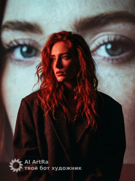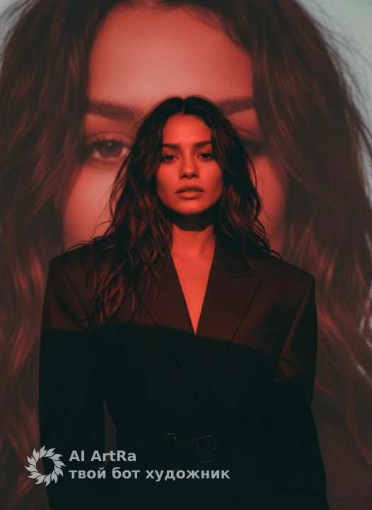 Выразительный портрет женщины в стиле высокой моды, крупным планом. Атмосферный художественный портрет в эстетике нуар и авангардной моды. Она в темном оверсайз текстурированном пиджаке . волосы волнистые, небрежные длинные. Холодное красное освещение, зернистая пленка, резкие тени. На заднем плане гигантская проекция пары её глаз. Видно только глаза референса, они занимают весь фон. Высокое качество, 35mm film, dramatic