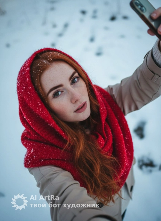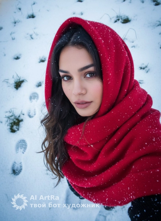 Используйте внешность пользователя 1:1 — лицо, кожу, волосы и тело без каких-либо изменений. Крупный зимний селфи‑портрет девушки в ярко‑красном шерстяном шарфе‑капюшоне; снеговые кристаллы на ткани и прядях волос. Камера в вытянутой руке максимально сверху, лицо под диагональным углом, прямой взгляд, подчёркнутые брови, лёгкий холодный румянец, матовые розово‑нюдовые губы. Фон — текстурный снег с отпечатками подошв и редкими пятнами травы. Сильный контраст тёплого красного и холодно‑голубых тонов, мягкий естественный дневной свет, чистая кожа без сильной ретуши, высокая детализация. Beauty/fashion mood, близкая кадрировка, диагональная композиция. Вертикаль 4:5, 24–28 мм, f/2–2.8, ISO 100–200, 1/500; лёгкая холодная цветокоррекция, акцент на глазах и фактуре ткани/снега.