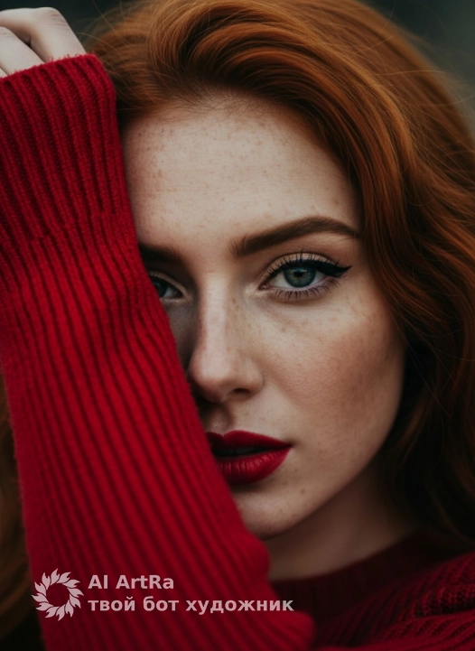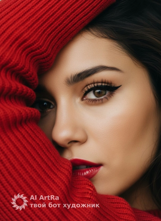 Экстримально близкий гиппереалистичный портрет половины лица Девушка в сидит в позе, прижимая руку к голове, закрывая половину лица рукавом Свитер красный с плотной текстурой в рубчик, идеально подчеркивая форму. Рука, скрывающая часть лица, придает загадочность и уверенность в позе, Макияж акцентирует внимание на глазах — черные стрелки, густые ресницы и легкий золотистый акцент на веках, создавая драматический контраст с яркими красными губами, которые насыщенно подчеркивают ее форму. Камера настроена на макро-уровень, прижимая изображение очень близко, с ультра-узким фокусом: её глаз и освещённая кожа под ним идеально резкие Кожа изображена с детализированной жизненной точностью — тонкие поры, едва заметные несовершенства и мягкая текстура, переданные с фотографической реалистичностью. Текстура кожи видна в мельчайших деталях, создавая эффект реализма. Атмосфера дорогой бьюти-съёмки,. Качество 8K, высокая резкость, глубокая проработка микро-деталей, киношная контрастность, премиальный beauty-shoot. —ar 3:4 —v 6Use the user's appearance 1:1 — face, skin, hair and body without any changes.