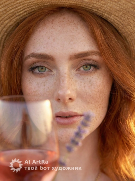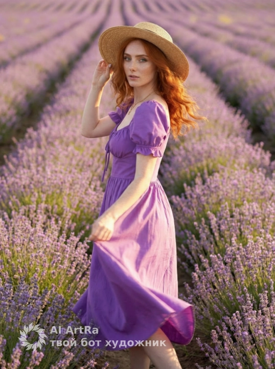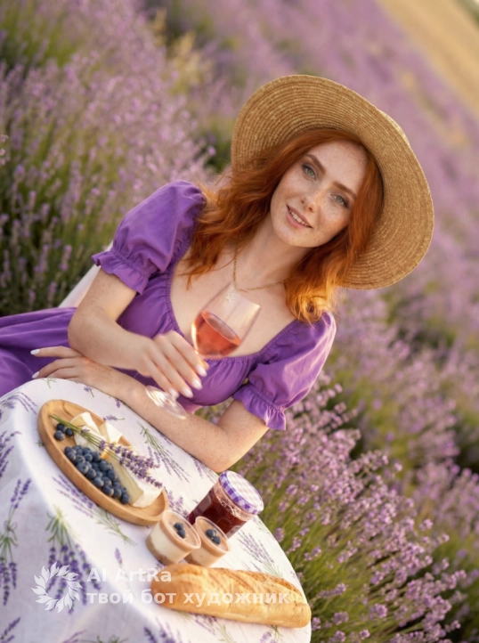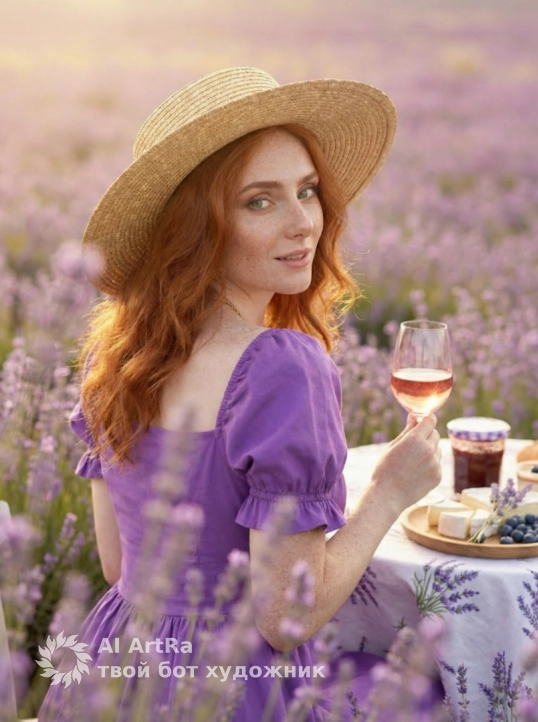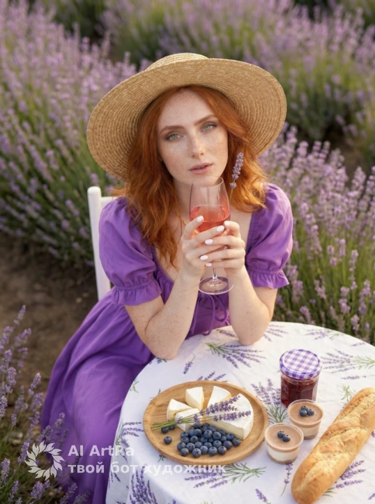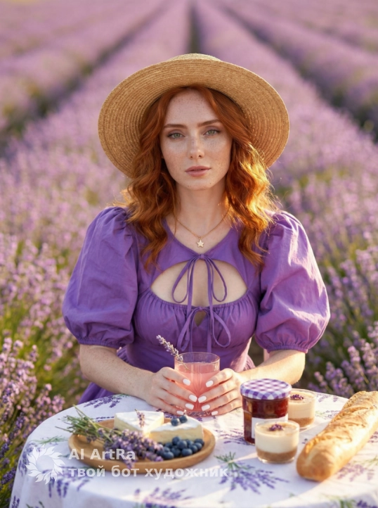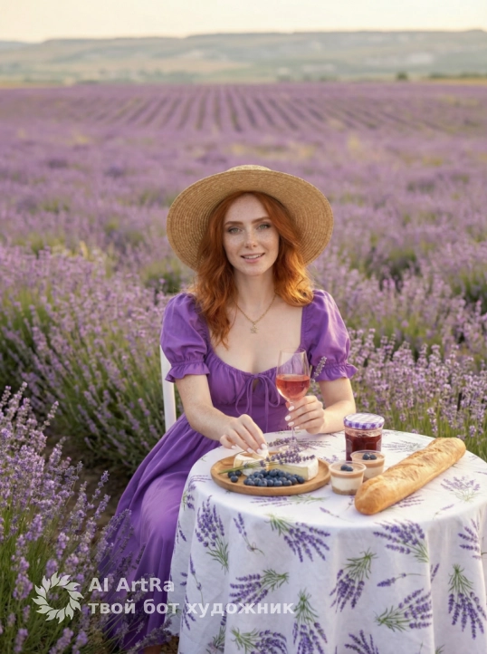 Используйте внешний вид пользователя, референса 1:1 — лицо, кожу, волосы и тело без каких-либо изменений. На изображении — женщина в элегантном фиолетовом платье с пышными рукавами и вырезом на груди, украшенном завязками, сидит за круглым столом, покрытым белой скатертью с фиолетовым лавандовым принтом, в окружении бескрайнего поля лаванды; на голове — широкополая соломенная шляпа, на шее — тонкая золотая цепочка с подвеской в виде звезды, на пальцах — аккуратный белый маникюр; в руках — стакан с розовым напитком и ветка свежей лаванды; на столе — деревянная тарелка с кусочками сыра, черникой и лавандой, баночка варенья с клетчатой крышкой, два маленьких стаканчика с десертом и багет; композиция — средний план, ракурс немного сбоку, камера на уровне глаз, мягкий дневной свет с теплым оттенком, создающий романтичную, умиротворяющую атмосферу летнего пикника; стиль — реалистичная фотография с легкой художественной обработкой, акцент на текстурах ткани, соломы, лепестков и еды, глубина резкости мягко размывает фон, подчеркивая главный объект и детали стола.
