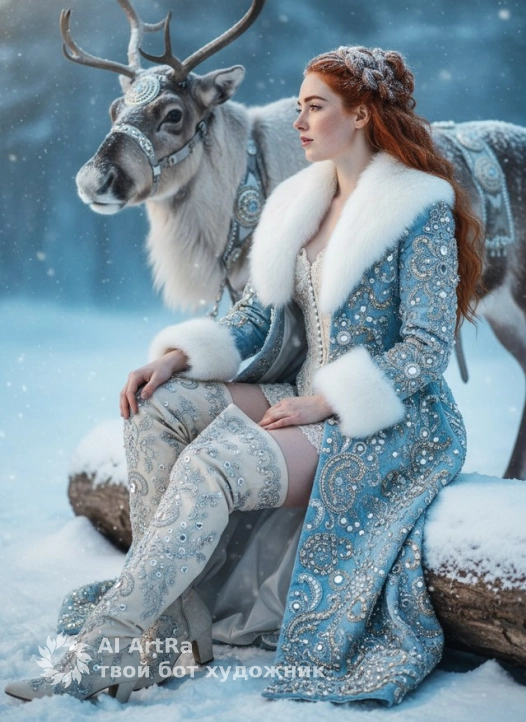 Winter cinematic portrait, Ice‑Queen seated on a snowy log; pose: 3/4 body, face in right profile, left elbow on raised knee, right hand on thigh; two reindeer behind with ornate silver harnesses and large medallions. Sky‑blue velvet/jacquard long coat, fully covered with silver‑gold embroidery, beads, crystals and mirror medallions; wide white‑fur shawl collar and cuffs; ivory lace corset visible at neckline; ivory thigh‑high boots, fully embroidered with filigree, mirror medallions, crystals, white‑fur cuffs, almond toe, low hidden heel. Platinum braided updo with light frost; porcelain skin; soft cold side light, gentle rim light, snow dust, blue haze; photoreal, couture, hyper‑detailed seams/stitches/fur and fabric texture; 85mm, f/2–2.8, shallow DOF, high resolution. Negative: logos/watermarks, neon colors, modern zippers, anatomy errors, flat light.