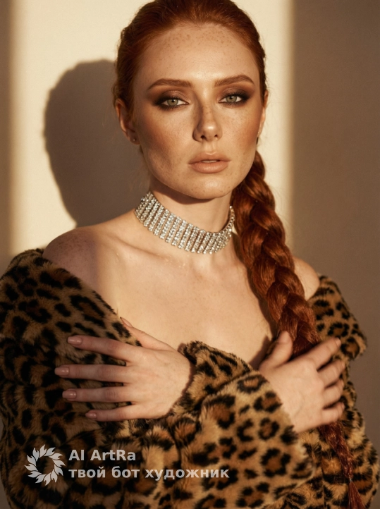• Одежда и текстура: плотная леопардовая шуба (меховый или искусственный текстиль) с заметной фактурой и крупным принтом; шуба спущена с плеч, плотно охватывает руки и туловище.Украшения: массивный блестящий чокер/ожерелье из кристаллов/страз, хорошо сидящий на шее, крупные блески отражают свет.