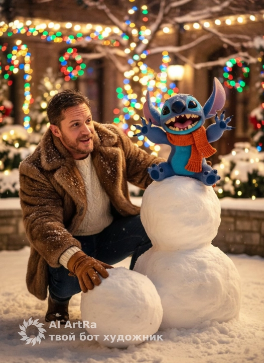 Stitch, wearing an orange scarf, sits playfully atop the snowman, laughing with his blue hair catching the warm glow of the lights.