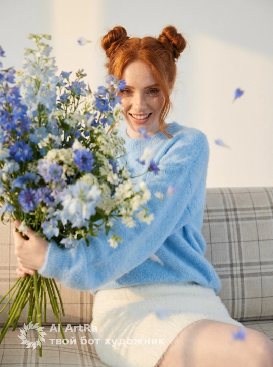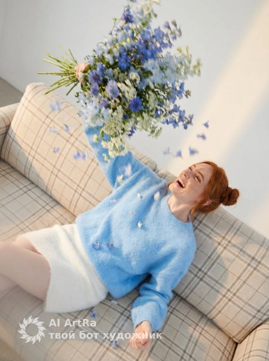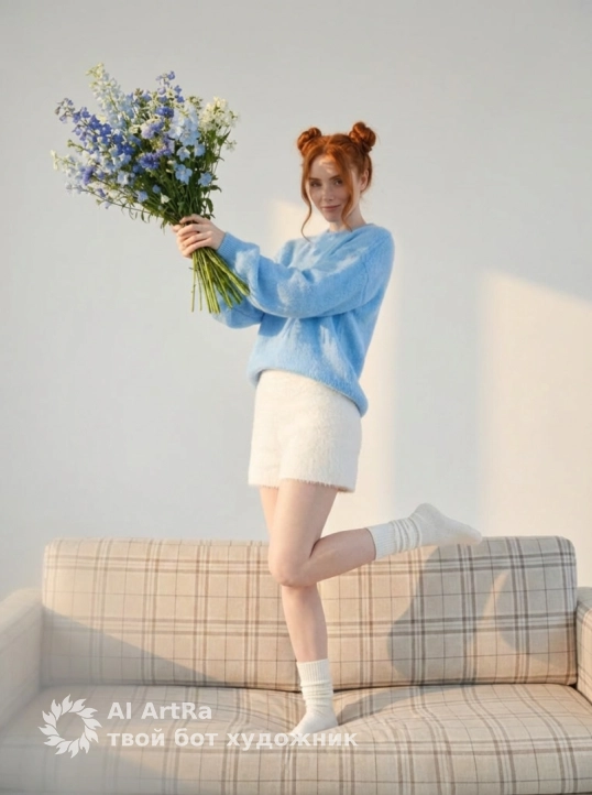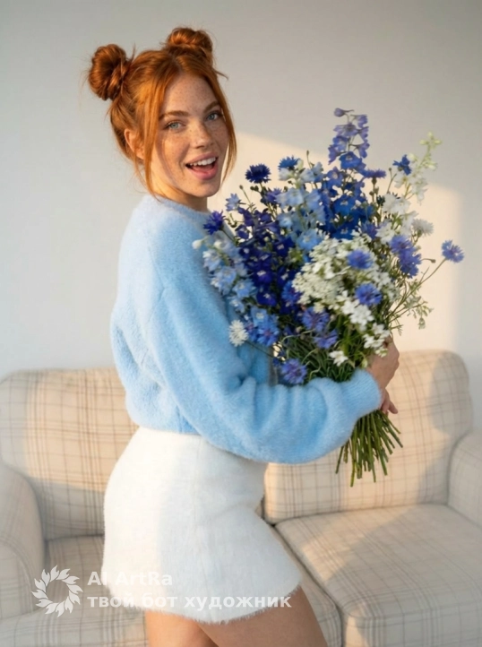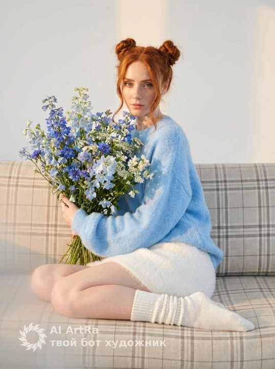 Она одета в нежно голубую пушистую кофту оверсайз частично заправленную в пышную легкую белую короткую юбку и в вязанных белых длинных ночках собранных в складки.