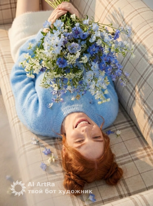 На голове два пучка и пару прядей у лица, в руках у неё огромный очень большой букет полевых голубых и синих и белых цветов , фото в золотой час