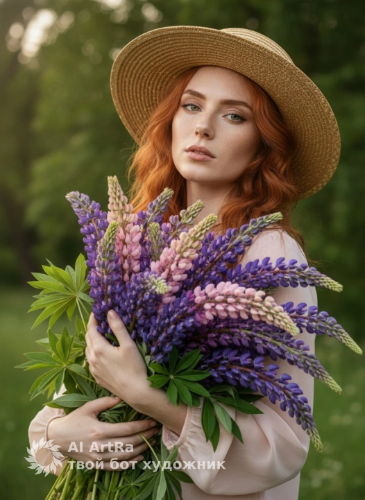 Используйте внешний вид пользователя, референса 1:1 — лицо, кожу, волосы и тело без каких-либо изменений. На изображении — женщина в широкополой соломенной шляпе с тонкой плетёной текстурой и едва заметными золотистыми блёстками по краю, держащая в объятиях крупный букет люпинов — фиолетовых и нежно-розовых, с зелёными стеблями и листьями, которые мягко обрамляют её руки; на ней лёгкая бледно-розовая блузка с прозрачными рукавами, слегка собранными на запястьях, и небольшими рюшами на манжетах; макияж естественный, с акцентом на чётко очерченные брови, тонкой стрелкой на верхнем веке и нюдовым оттенком губ; ногти короткие, ухоженные, без лака; украшений нет; снимок выполнен в стиле высокого реализма, с мягкой, рассеянной вечерней подсветкой, создающей золотистый боке на фоне размытых зелёных деревьев и листвы; камера расположена на уровне глаз, кадр средний — от груди вверх, с лёгким ракурсом снизу, что придаёт фигуре воздушность; композиция смещена вправо, букет занимает левую часть кадра, создавая диагональный баланс; атмосфера — мечтательная, спокойная, с лёгкой ностальгией, как будто застывший момент летнего вечера в саду.