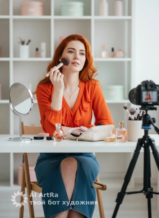 Используйте внешний вид пользователя, референса 1:1 — лицо, кожу, волосы и тело без каких-либо изменений. На изображении — женщина в процессе нанесения макияжа с помощью кисти на щеку, в руке — кисть для пудры, взгляд направлен вверх, губы слегка приоткрыты, выражение сосредоточенное и мягкое; макияж естественный, с акцентом на сияние кожи и нежный румянец, ногти короткие, ухоженные, без лака; на шее — тонкая цепочка с небольшим подвесом, на ушах — небольшие серьги-гвоздики; одета в ярко-оранжевую блузку с воланами и джинсовую юбку с разрезом; сидит на стуле за белым столом, перед ней — зеркало на подставке, косметичка, флаконы и кисти в стакане; в правой части кадра — цифровая камера на штативе, направленная на неё, как будто она снимает видео для блога; фон — светлая комната с белым модульным шкафом, на полках — коробки, флаконы, канцелярия; освещение мягкое, рассеянное, студийное, с естественным теплым оттенком; стиль — высокореалистичная цифровая фотография с акцентом на детализацию текстур (ткани, кожи, металла); композиция — средний план, ракурс немного снизу, камера на уровне груди, объект расположен в центре кадра, слегка смещён влево; атмосфера — уютная, профессиональная, творческая, с ощущением личного пространства и процесса самовыражения.