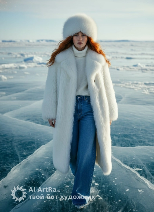 Кинематографичный fashion-крупный план в арктической эстетике. Персонаж идёт по растрескавшемуся леднику, точное лицо сохранено без изменений. Образ — длинная белая меховая шуба, массивная меховая шапка, белая водолазка и широкие синие джинсы. Жёсткий холодный дневной свет, глубокие тени и блеск ледяных кристаллов усиливают реализм. Лёгкий ветер приподнимает мех и пряди волос, а трещины льда с голубыми глубинами формируют атмосферу высокодетализированной арктической модной съёмки.