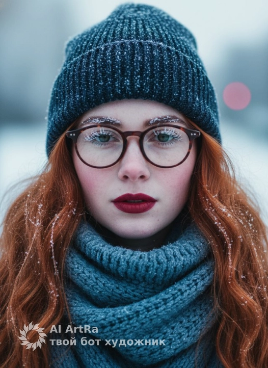 A close-up photo of a cinematic winter portrait inspired by analog film photography. The woman in the photo wears a dark blue textured knit hat and a thick blue wool scarf, sprinkled with fine frost crystals. Add realistic frost to the eyelashes, eyebrows, and hair ends, creating a natural combination of light and texture. The skin tone should appear cool and rosy—rosy cheeks and nose, subtle pink highlights on the skin. Lips: deep red matte. Soft natural daylight, slightly blown-out whites, diffused by the cool air. Background: minimalist, pale winter light with a shallow depth of field. Cool whites, muted blues, and warm raspberry accents. High quality. The result should appear photorealistic, cinematic, and emotionally vivid, with nanoscale detailing of skin texture, frost particles, and fabric fibers.