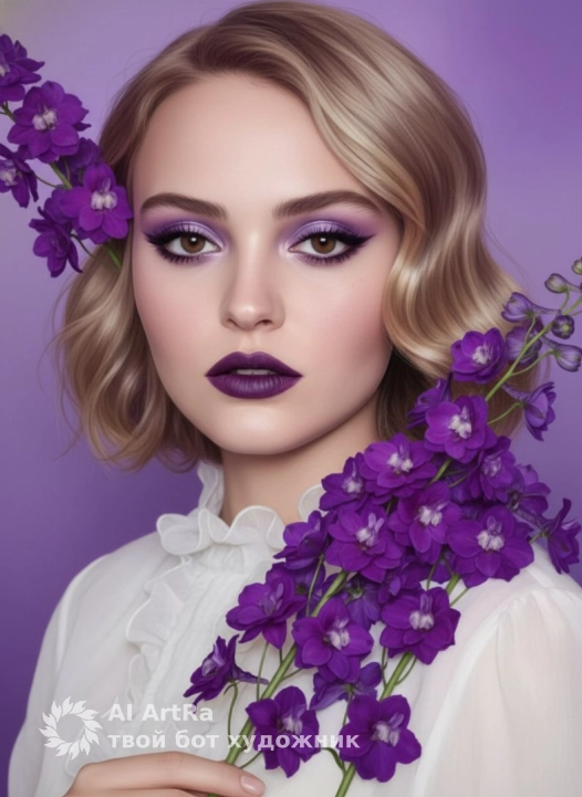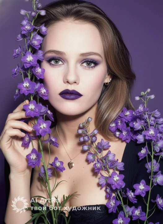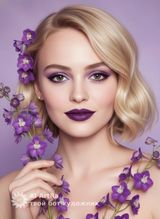 A striking portrait of a woman, showcases a captivating aesthetic with striking makeup and a vibrant floral arrangement. The woman has hair styled in loose waves, and eyes accentuated by expertly applied lilac eyeshadow, eyeliner, and dark eyelashes. Her lips are painted in a matte, deep-purple lipstick, perfectly complementing the floral elements. She gently holds a branch of vibrant purple delphiniums, with the flowers arranged around her face and shoulder. The lighting is soft and diffused, casting gentle shadows and highlighting the skin's luminosity. The background is a gradient of purple hues, adding depth to the image and ensuring the focus remains on the woman and the flowers. The overall atmosphere is ethereal and artistic, creating a sense of elegance and serenity, evoking a sense of natural beauty and high-fashion glamour. The style blends elements of portrait photography with fashion editorial flair, with a painterly quality achieved through soft lighting and careful color harmony.