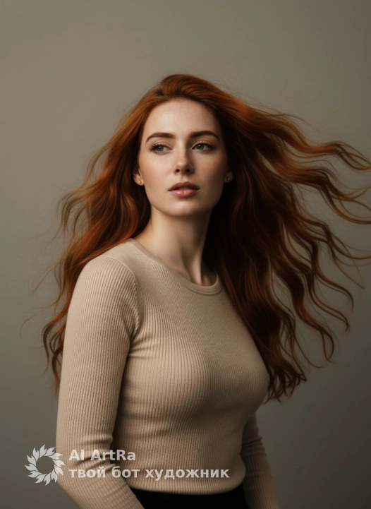 Используйте внешний вид пользователя, референса 1:1 — лицо, кожу, волосы и тело без каких-либо изменений. Изображение представляет собой студийный портрет женщины в динамичной позе, где её длинные, свободно развевающиеся волосы создают ощущение движения и воздушности, словно замороженный момент ветра; макияж естественный, акцент на губах с нежным блеском, брови чётко очерчены, взгляд направлен немного вверх с лёгкой задумчивостью; на ней облегающий трикотажный топ светло-бежевого оттенка с длинными рукавами и округлым вырезом; маникюр и украшения отсутствуют; фон — однородная матовая стена нейтрального серо-бежевого тона; освещение мягкое, рассеянное, студийное, создающее плавные тени и подчёркивающее текстуру ткани и волос; композиция — средний план, ракурс немного снизу, камера фокусируется на лице и верхней части тела, создавая эффект глубины и элегантной драматичности; атмосфера — спокойная, чувственная, с ноткой романтической мечтательности; стиль — гиперреализм с элементами модной фотосессии, чёткие детали, естественные текстуры, высокая резкость и глубина цвета.