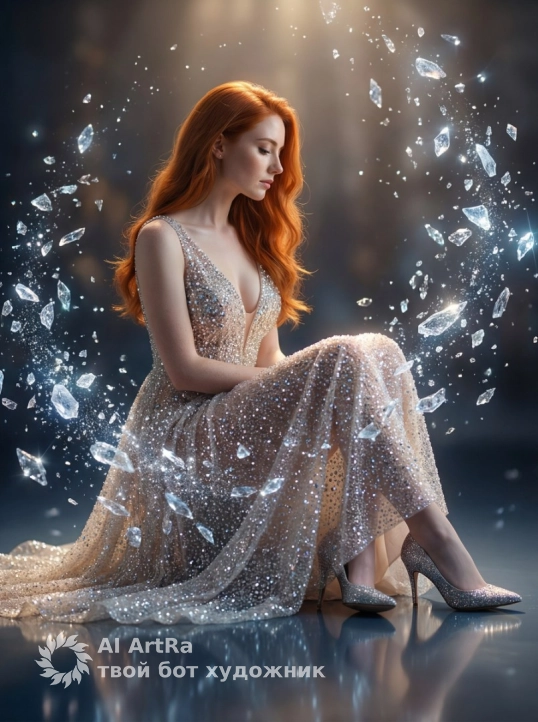 Не меняя внешности женщины с фото, изящная фигура в атмосфере волшебного сияния, окружённая сверкающими осколками льда или хрусталя, парящими и мерцающими вокруг, создающими сказочный вихрь. Она сидит на блестящей поверхности с лёгкой размытостью отражения, повернута вправо, взгляд опущен вниз, передавая спокойствие и задумчивость. Длинные волосы распущены, мягко спадают на плечи, слегка развеваются. На ней сверкающее платье с глубоким вырезом, струящееся вокруг ног и тела, покрытое мельчайшими блестками, светящееся и лёгкое. Острые высокие туфли на каблуках, также блестящие. Свет сверху и слева мягко подсвечивает кожу, создавая деликатные тени, добавляя кинематографичный объём и глубину. Тёмный фон подчёркивает контраст света и тьмы, сосредотачивая внимание на фигуре и сияющих деталях. Композиция передаёт тишину и волшебство, элегантность и утончённость в гармонии с магическим светом, фотореалистичное изображение, высокая детализация, качество 4K.