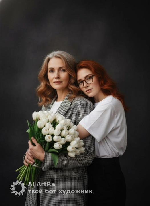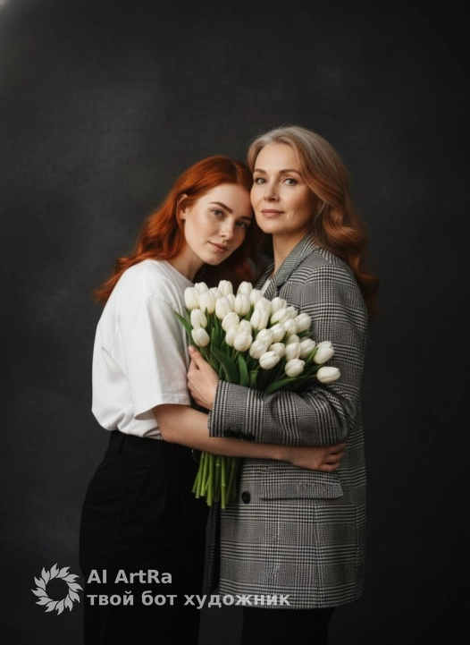 This prompt must be applied to the people in the photo. Important: Do not change or distort faces. Do not alter facial expressions. Faces must be preserved completely, as in the original photos. Use the facial features and likeness from the provided reference images. Generate the scene around them, but keep their faces identical. Prompt: This prompt must be applied to the people in the photo. Important: Do not change or distort faces. Do not alter facial expressions. Faces must be preserved completely, as in the original photos. Use the facial features and likeness from the provided reference images. Generate the scene around them, but keep their faces identical. Prompt: A medium-shot studio photo of two women, an older woman and a younger woman, embracing. The older woman holds a bouquet of white tulips against a dark background, while the younger woman hugs her from behind. They stand sideways to the camera and look into it. The younger woman leans her head on the older woman's shoulder. The older woman is wearing a stylish double-breasted gray and white checked jacket over a white top and holds a large bouquet of white tulips in front of her. The younger woman is wearing a simple oversized white T-shirt tucked into black high-waisted pants. The photo was taken indoors in a professional photo studio against a plain, seamless background with a very dark texture of gray and black (melange). Soft, diffused, and slightly directed studio lighting from the front creates soft highlights, avoiding harsh shadows and emphasizing the figures against the dark background. Shot with an 85mm portrait lens for photorealistic results.
