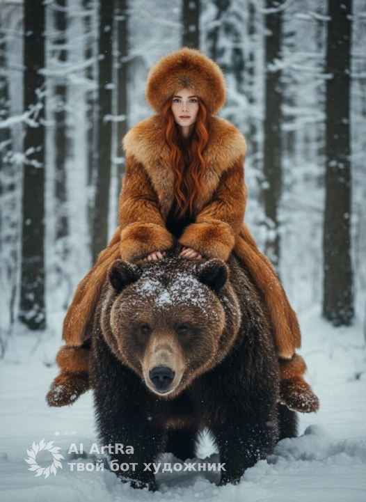 Не меняя внешности женщины с фото, она встала посреди зимнего леса, где сугробы снега укрывают землю, а стройные, высокие деревья с тонкими стволами вздымаются в глубину, покрытые свежим пушистым снегом. Женщина сидит верхом на гигантском буром медведе, покрытом густой шерстью с обвалившимися снежинками, которая выглядит мягкой, но массивной и величественной. На ней длинная шуба из рыжевато-золотистой меховой ткани с пушистым объемным воротником, который обрамляет лицо, создавая золотистое сияние и теплоту в этом холодном окружении, а на голове у неё большой меховой кокошник с такой же роскошной и густой текстурой, подчеркивающий изысканный, но суровый зимний стиль. волосы свободно спадают на грудь, придавая образу легкую непринужденность на фоне роскоши меха. Женщина смотрит прямо в камеру, лицо с ясным, глубоким взглядом, её выразительные черты лица подчёркнуты мягким светом, который падает спереди, создавая естественные тени на щеках и под подбородком, придавая изображению глубокий драматизм и атмосферу. Ее руки спокойно лежат на массивной главе медведя, усиленной едва заметным слоем снега, а ноги, обутые в сапоги из того же меха, что и шуба, слегка обнажены, что контрастирует с белой, искрящейся снеговой поверхностью. Фон в полумраке, где тени деревьев создают тонкую игру светотени, добавляя кинематографическую глубину и ощущение волшебства этой зимней сцены, где природа и человек удивительным образом гармонируют. Всё это впечатление наполняет кадр холодным дыханием зимы и теплом живого присутствия, соединяя мистику леса и силу природы в одном волнистом кадре, фотореалистичное изображение, высокая текстурная детализация, высокое качество, разрешение 4K.