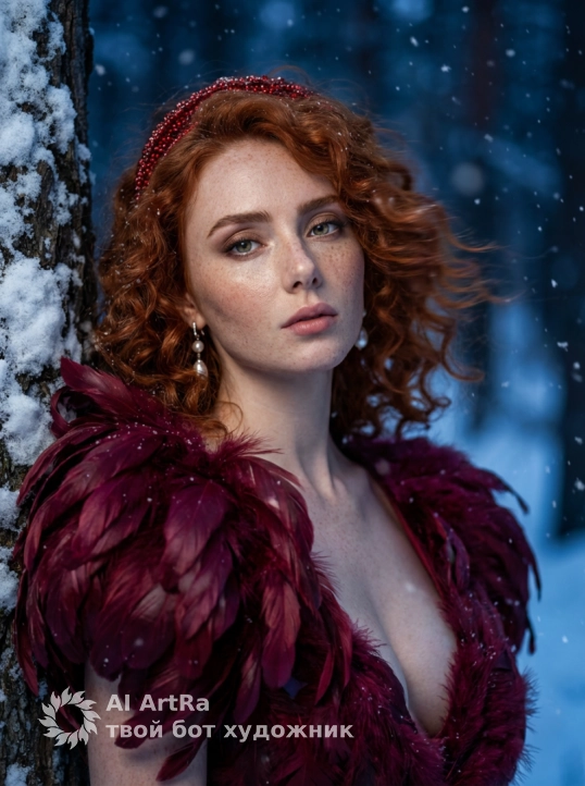Платье — это объемное творение высокой моды, полностью выполненное из крупных, фактурных бордовых перьев, расположенных на плечах и открывающих декольте. Девушка находится в динамичной и чувственной позе, прислонившись к заснеженному дереву. На ней жемчужные серьги.