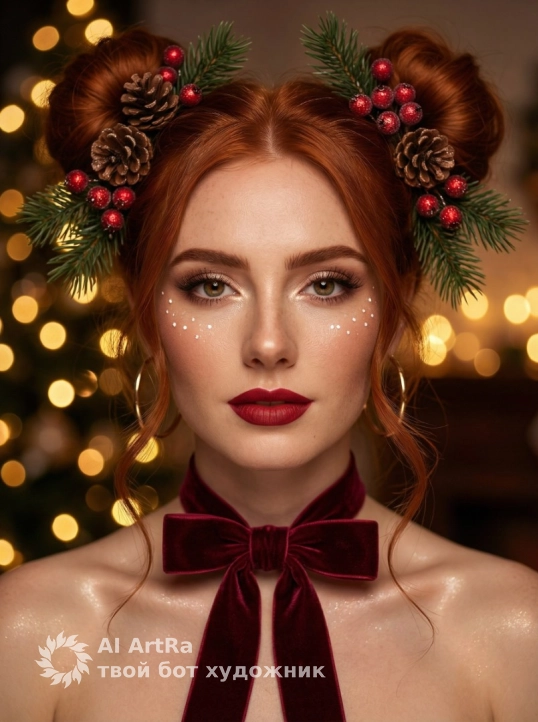 Не меняя внешности женщины с фото, образ в изысканном праздничном ключе: голова слегка повернута к зрителю, взгляд прямой, выражающий уверенность и тепло. Волосы собраны в два пышных пучка с еловыми ветками, шишками и блестящими ягодами, добавляющими естественность и праздничность. Макияж безупречный с акцентом на выразительные глаза, густые брови, длинные ресницы и глубокие красные губы на фоне сияющей кожи. Одежды нет. Под глазами белые точки, как снег или мерцание, усиливающие волшебство. Золотистые серьги частично видны через локоны, добавляя роскошь. Шея украшена атласным или бархатным бордовым бантом, подчеркивающим плечи и ключицы с нежным подсвечиванием. Фон размытый с золотистым свечением гирлянд, тени мягкие, плавные, создают глубину и объем. Свет и композиция с бежевыми и золотистыми оттенками создают уютную зимнюю атмосферу. Фотореалистичное изображение, высокая детализация, качество 4K.