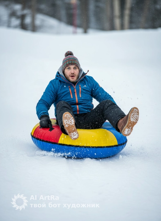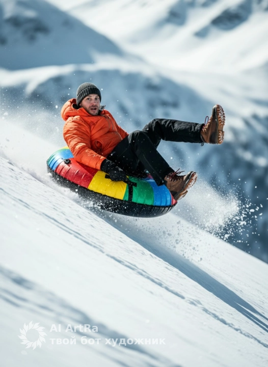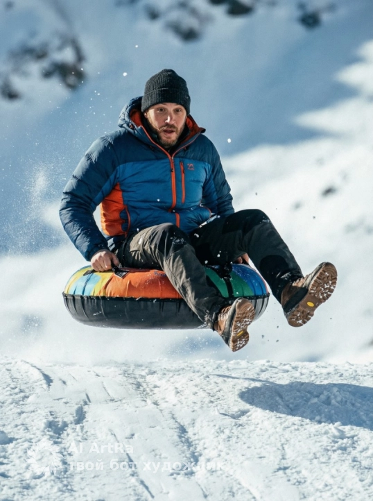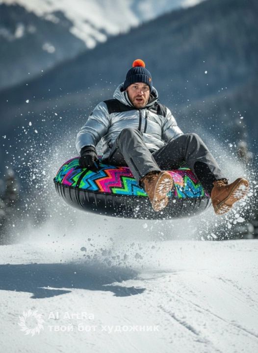 Hyper-realistic action sports photography. A man, exact facial features and proportions preserved from the reference photo, caught in mid-air jumping on a vibrant, colorful inflatable snow tube down a steep snowy slope. He is in a dynamic pose, body tilted back, legs lifted, snow spraying everywhere. His expression is a mix of intense focus and slight surprise. He wears a stylish winter beanie, a high-quality technical puffer jacket, insulated trekking pants, and rugged winter boots. Lighting: bright natural daylight with crisp shadows. Background: blurred snowy mountainside to emphasize speed. Technical specs: shot on Sony A7R IV, 35mm lens, f/2.8, 1/4000s shutter speed to freeze motion, high grain detail, 8k resolution, cinematic color grading.Hyper-realistic action sports photography, 9:16 aspect ratio. A 40-year-old man, exact facial features and proportions preserved from the reference photo, caught in mid-air jumping on a vibrant, colorful inflatable snow tube down a steep snowy slope. He is in a dynamic pose, body tilted back, legs lifted, snow spraying everywhere. His expression is a mix of intense focus and slight surprise. He wears a stylish winter beanie, a high-quality technical puffer jacket, insulated trekking pants, and rugged winter boots. Lighting: bright natural daylight with crisp shadows. Background: blurred snowy mountainside to emphasize speed. Technical specs: shot on Sony A7R IV, 35mm lens, f/2.8, 1/4000s shutter speed to freeze motion, high grain detail, 8k resolution, cinematic color grading. крупный план
