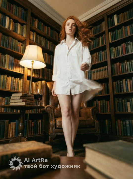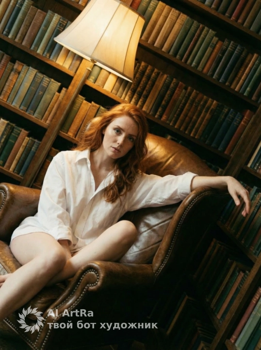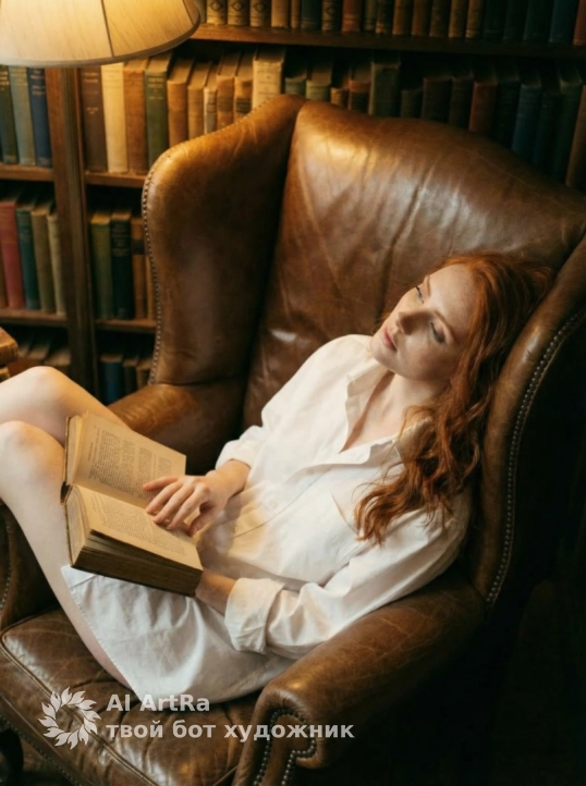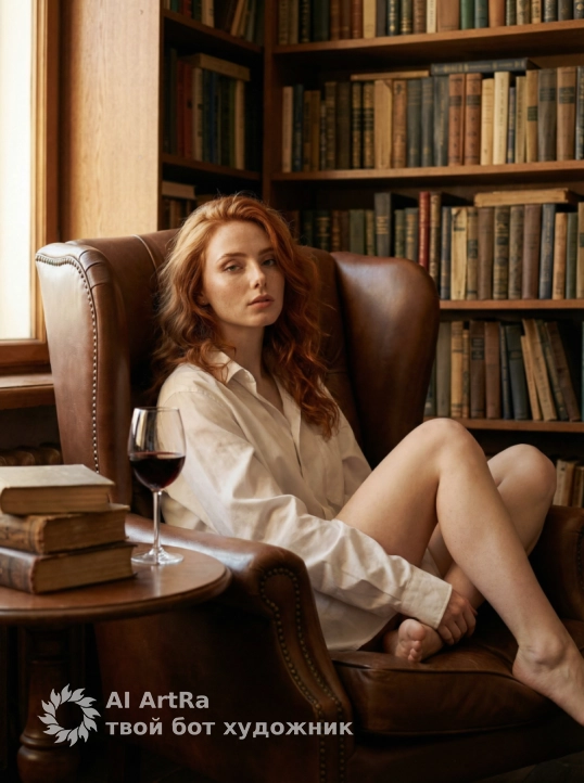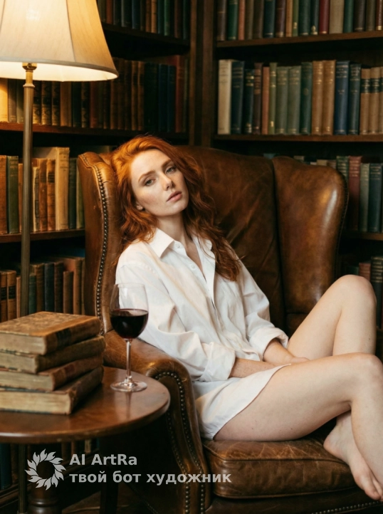 Уютная винтажная библиотека. Женщина в расслабленной позе сидит в коричневом кожаном кресле с высокой спинкой (wingback), одета в свободную белую рубашку, ноги обнажены и сложены крест-накрест. За спиной — плотные стеллажи с книгами. Боковой тёплый мягкий свет, мягкие тени, кинематографическая тёплая цветокоррекция. Рядом круглый деревянный столик с бокалом тёмного вина и стопкой старых книг. Низкая глубина резкости, плёночное зерно, натуральная редакционная поза, элегантный и интимный тон, 50mm, f/1.8, высокое разрешение, мягкая ретро-атмосфера.
