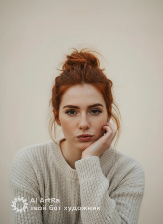 На изображении девушка с волосами, собранными в небрежный пучок. Она одета в светлый бежевый свитер с длинными рукавами. Девушка опирается на руку, поддерживая голову, и смотрит прямо в камеру. Её губы слегка надуты, создавая задумчивое выражение лица. Фон изображения нейтральный, светлого бежевого цвета, что позволяет сосредоточиться на девушке. В её ушах видны маленькие серьги. Общий стиль фотографии расслабленный и естественный.