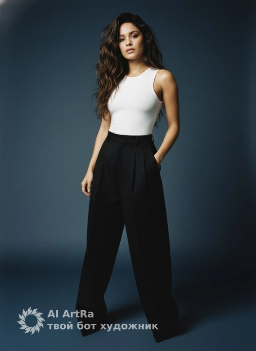 Используйте внешность пользователя 1:1 — лицо, кожу, волосы и тело без каких-либо изменений. Уверенная позирующая модель в стиле модного журнала. Съёмка в полный рост с немного нижнего ракурса. Модель одета в облегающий белый топ, и мешковатые чёрные брюки, рука небрежно засунута в карман. Пышные локоны. Изображение расположено на бесшовном тёмно-сине-сером градиентном студийном фоне. Мягкое, драматическое освещение создаёт гнетущую, прохладную атмосферу с лёгкими бликами и глубокими тенями. Профессиональная фотография, чёткий фокус, кинематографическая эстетика, текстура плёночного зерна, слегка приглушённая цветовая палитра. Не меняй внешность пользователя.