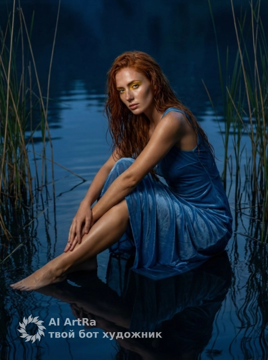 Не меняя внешности женщины с фото, она сидит на полу в полумраке, окружённая тонкими высокими тростниковыми стеблями, вырастающими из зеркальной поверхности воды, создавая атмосферу загадочной водной глади. Тело слегка повернуто к зрителю, руки сложены на правой согнутой ноге, левая вытянута вперёд. На ней лёгкое прозрачное голубое платье, струящееся складками, подчёркивающее бархатистую структуру материала. Стоячие волны и отражения придают глубину, усиленную тёмно-синим фоном, напоминающим ночное небо или пруд, создавая умиротворённый, но напряжённый момент. Лицо обращено к зрителю с решительным выражением и ярко-жёлтым макияжем вокруг глаз, контрастирующим с ровным загаром и естественным блеском кожи. Влажные, слегка спутанные волосы ниспадают на плечи, отражая мягкий свет, добавляя динамику и водную тему образу. Тени и свет подчёркивают изгибы тела и создают атмосферу загадочности и глубины. Композиция передаёт эффект присутствия в мистическом водоёме, где природа и человек сливаются в образе таинственной красоты, усиленный мерцанием и многослойным светом, придающим кинематографичность и насыщенность. Сцена вызывает меланхолию и магическое очарование, фотореалистична, с высокой детализацией и качеством 4K.
