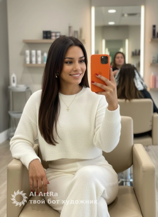 Pose: seated slightly sideways in a beige salon chair, torso turned toward the mirror; right hand holding the orange 17 Pro Max, left hand resting casually near the chair’s armrest; long straight hair falling over shoulders.