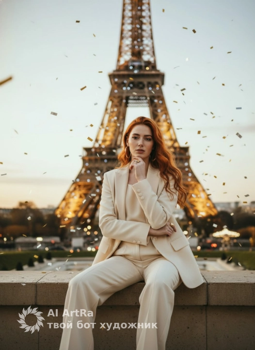 A hyperrealistic editorial photograph, a dynamic full-body shot of a woman from photo seated elegantly on the edge of a stylish concrete bench on Trocadéro, with the sparkling Eiffel Tower and its light show serving as the majestic, golden backdrop. She is captured in a moment of serene poise: one leg is gracefully crossed over the other at the ankle, her spine is long and straight, and her shoulders are softly rolled back. One arm rests lightly on her thigh, while the other is bent, her fingers gently brushing her chin in a thoughtful, feminine gesture. New Year's confetti is caught mid-air around her.