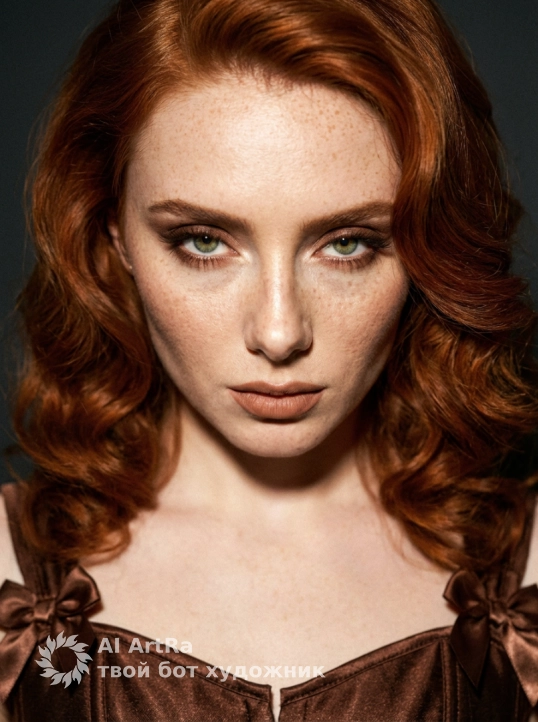Женщина с дерзким выражением лица, она смотрит в камеру. На глазах коричневые растушеванные длинные стрелки, длинные коричневые ресницы Лицо опущено вниз. Волосы распущенные в стиле Олд Мани Губы с матовой коричнево-бежевой помадой. Одета в корсет коричневый с бантами на плечах освещение драматичное. Глаза и лицо ярко освещены. Драматичное освещение