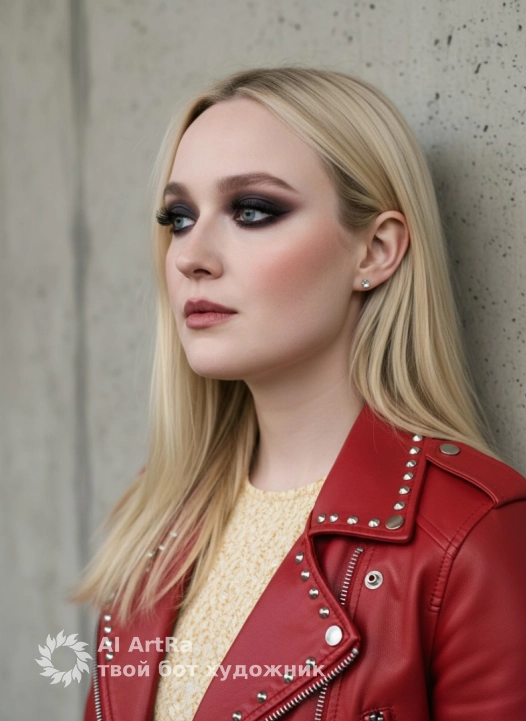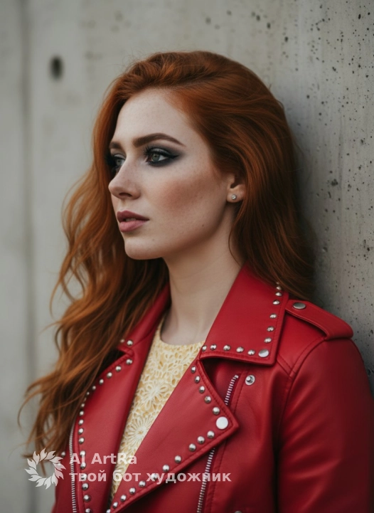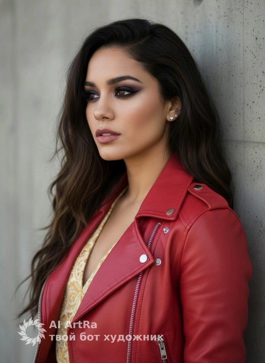 Используйте внешний вид пользователя, референса 1:1 — лицо, кожу, волосы и тело без каких-либо изменений. На лице — драматичный вечерний макияж: глубокие дымчатые тени с акцентом на верхнем веке, чётко прорисованные стрелки, подчёркнутые ресницы, матовая розовая помада с лёгким блеском на губах, румяна, мягко моделирующие скулы. На ушах — маленькие серебристые гвоздики-гвоздики. На ногтях — натуральный, ухоженный маникюр без лака. Главный объект — женщина в позе, слегка прислонившейся к бетонной стене, смотрящая в сторону, в профиль, с лёгким поворотом головы к камере. Стиль — гиперреалистичная студийная фотография с мягким, рассеянным освещением, создающим естественные тени и объём. Фон — текстурированная серая бетонная стена с видимыми швами и неровностями, слегка размытая на заднем плане. Освещение — мягкое, боковое, подчёркивающее черты лица и фактуру кожи. Цветовая палитра — контраст между ярко-красной кожаной курткой-байкеркой с металлическими заклёпками и молниями, и тёплым жёлто-кремовым топом с тонким узором. Композиция — средний план, ракурс с лёгким нижним углом, фокус на лице и верхней части туловища. Атмосфера — уверенная, загадочная, немного меланхоличная, с ноткой рок-н-ролльного шика.