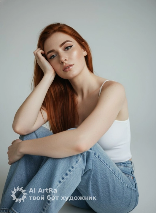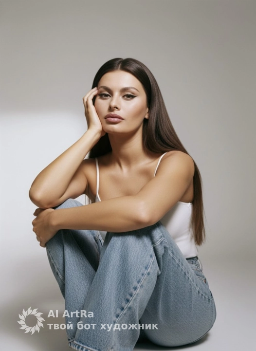 This is a selfie. Ultra-detailed close-up portrait снятый фронтальной камерой смартфона: камера низко, чуть ниже уровня лица, направлена вверх, создавая мягкую перспективу и подчёркивая положение головы, опирающейся на согнутое колено. Модель сидит на полу или низком стуле, обняв колени, левая рука лежит поверх ноги, правая поддерживает голову. Лицо повернуто немного вправо, взгляд направлен прямо в камеру, выражение спокойное и уверенное. Освещение ровное, студийное, мягкое рассеянное, без жёстких теней, создаёт чистый бьюти-глянец. Макияж чёткий: густые тёмные брови, вытянутые чёрные стрелки, длинные пушистые ресницы, сияющая кожа с влажным хайлайтом на скулах, носу и лбу, контуринг тёплый, губы крупные с плотным глянцевым финишем. Волосы прямые. Одежда: белый топ на тонких бретелях, свободные светлые джинсы oversize, текстура денима детализированная. Фон минималистичный светло-серый, чистый, с мягкими тенями на стене, создаёт ощущение студийного пространства. Стиль съёмки: high-resolution editorial selfie, чистые цвета, эффект дорогого бьюти-кадра.