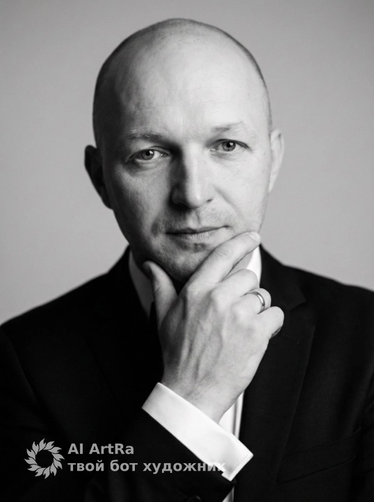 Close-up portrait of a man, angled at eye level, centered composition, touching his chin. Clothing and props: a formal black jacket, a white shirt with French cuffs, and a silver ring on his left hand. Setting and location: against a monochromatic light gray background, in a minimalist setting. Lighting and atmosphere: soft diffused light from the front, dim side lighting, soft shadows, a neutral and calm atmosphere. Technical specifications: shot with an 85mm portrait lens, shallow depth of field, background blur, photorealistic look, black-and-white film style with fine grain, 8K resolution, monochrome color palette, high detail.