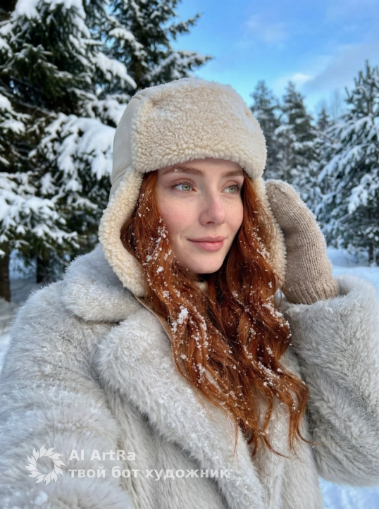 Color palette: cool whites and grays of the snow and clothing; deep greens of the pine trees; pale blue sky. Overall mood: cozy, serene, and festive—a trendy winter wonderland-style selfie with an emphasis on soft textures, fresh snow, and natural beauty. не меняй черты лица