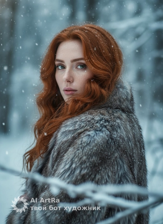 Кинематографичный портрет женщины с длинными волнистыми волосами с объемом у корней , холодная зимняя сцена, снегопад, мягкий рассеянный свет, shallow depth of field. Женщина оборачивается через плечо, выразительный взгляд, светлые глаза, пышные ресницы, аккуратный макияж с акцентом на глаза. Меховой плащ/шуба, текстура меха детализированная. Фон — заснеженный лес, размытые ветви на переднем плане, атмосферное боке. Фотореализм, ultra-high detail, 85mm lens, f/1.8, natural colors, cinematic mood, winter fantasy aesthetic, soft contrast, cold color grading. Use the user's appearance 1:1 — face, skin, hair and body without any changes.