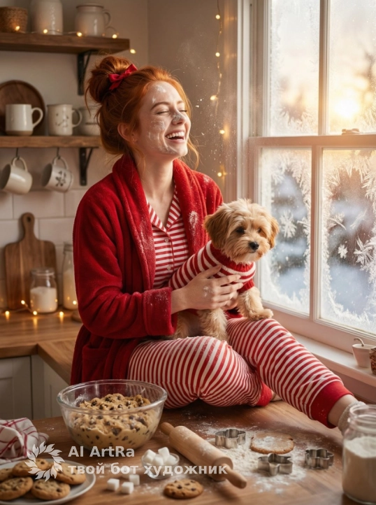 Не меняя внешности женщины с фото, она сидит на кухонном столе в уютной домашней атмосфере, залитой мягким теплым светом заходящего солнца, который проникает через окно, слегка запотевшее и украшенное снежными узорами, создавая иллюзию зимнего уюта. Женщина одета в пижаму с красно-белыми горизонтальными полосами и поверх нее пушистый красный халат. Волосы собраны в небрежный пучок с маленьким красным бантиком. Лицо её выражает радость и неподдельное веселье — она широко улыбается, глаза закрыты от смеха, и на её лице, руках и халате видны следы белой муки, часть которой в эпизодическом движении лепится в воздухе словно снежинки. В руках она держит пушистую маленькую собаку, одетую в подобную ей по стилю красно-белую полосатую кофточку, которая выглядит умиротворённой и кажется улыбающейся. На поверхности деревянного стола перед ней — прозрачная стеклянная миска с тестом для печенья с шоколадными каплями, рядом раскатанная скалка, сахарные кубики, печенья и формочки для вырезания, украшенные мукой. Кухонный интерьер выдержан в тёплых тонах — деревянные полки с керамическими чашками, подвешенными кружками и мягким гирляндным освещением, создающим уют и праздничное настроение в комнате. Свет от гирлянд и солнечные лучи формируют мягкие тени, глубина кадра ощущается благодаря легкой расфокусировке заднего плана. Атмосфера наполнена домашним теплом, беззаботностью и праздничной радостью момента, вызывая чувство уюта и счастья в зимний день, фотореалистичное изображение, высокая текстурная детализация, высокое качество, разрешение 4K.