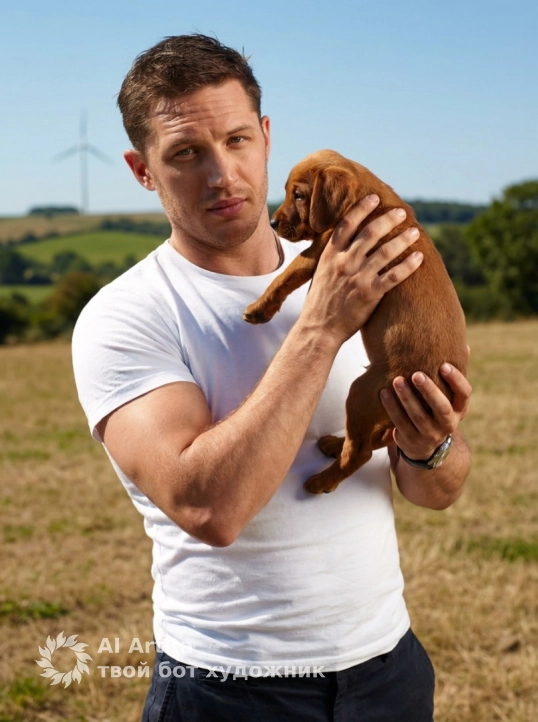 Фотореалистичный вертикальный портрет: молодой мужчина в обтягивающей белой футболке и тёмных брюках держит маленького рыжевато‑коричневого щенка обеими руками, поднимая его к себе; кадр от пояса вверх с акцентом на мускулистые предплечья и ладони, взаимодействие человек‑животное. Яркий солнечный день, тёплое естественное освещение, мягкие тени, насыщенные, но реалистичные цвета. Фон — поле с сухой травой, зелёные холмы и деревья, на горизонте ветряная турбина, ясное голубое небо. Небольшая глубина резкости (фон слегка размытый), высокая детализация текстур кожи и шерсти, натуральная, кинематографическая композиция. Камера на уровне груди, объектив около 35–50 мм, широкий динамический диапазон, высокое разрешение.